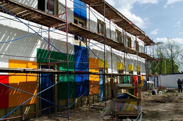На данный момент заканчиваются работы по фасадным панелям и завершено утепление фасада. Внутри закончены штукатурные работы и стяжка. Кабельные трассы разведены по помещениям, инженерные системы отопления и канализация смонтированы. Подрядчик готовится к шпаклевке стен и установке конечных элементов инженерных систем. Кроме того, здесь вывозят строительный мусор после кровельных работ и приступают к благоустройству, включая озеленение.