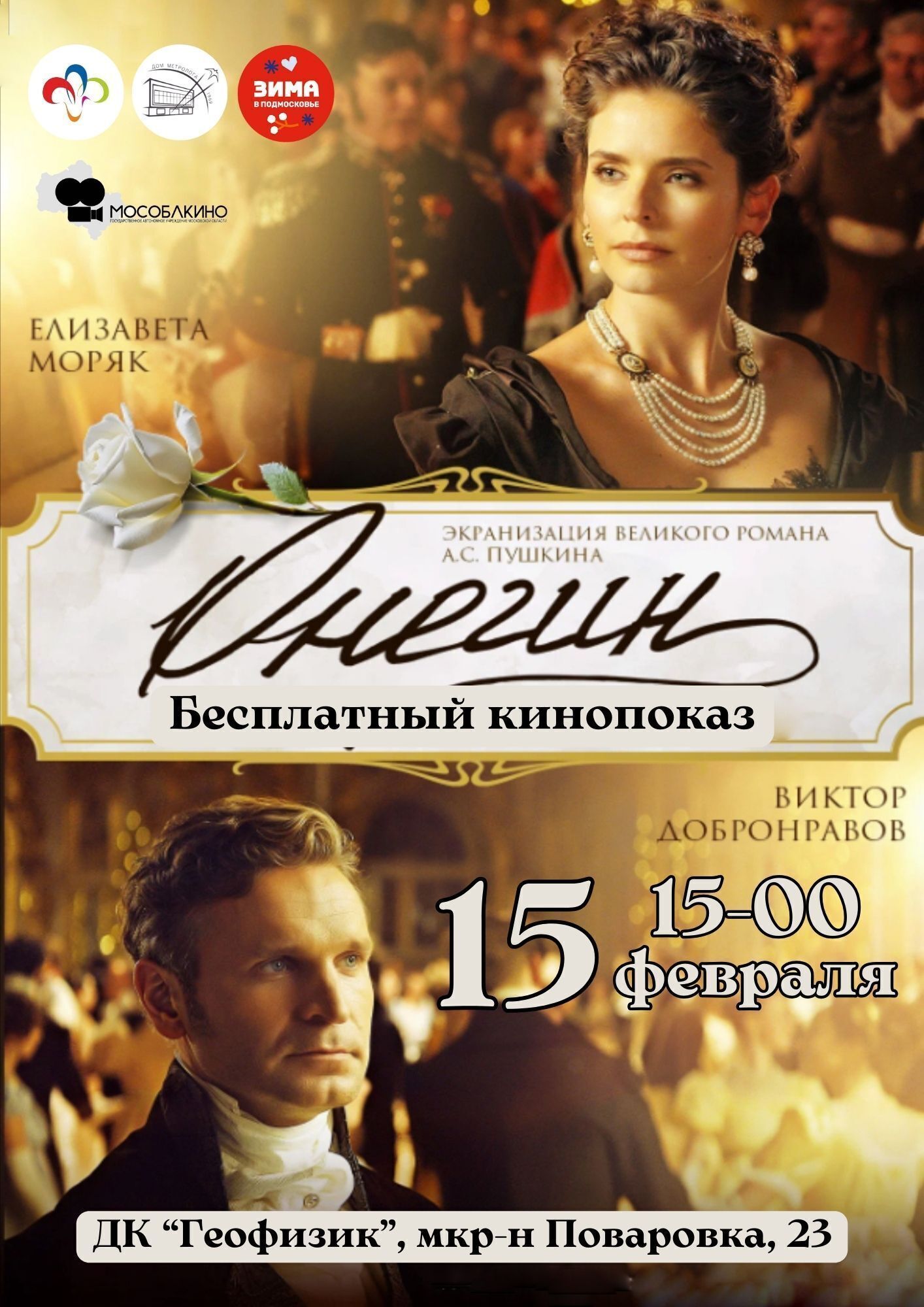 В субботу, 15 февраля, в Доме культуры «Геофизик» городского округа Солнечногорск состоится бесплатный кинопоказ экранизации романа Александра Пушкина «Онегин». Начало сеанса в 15:00.