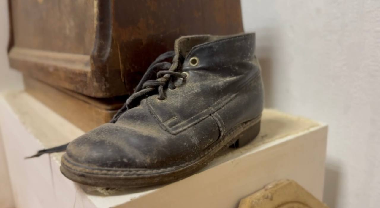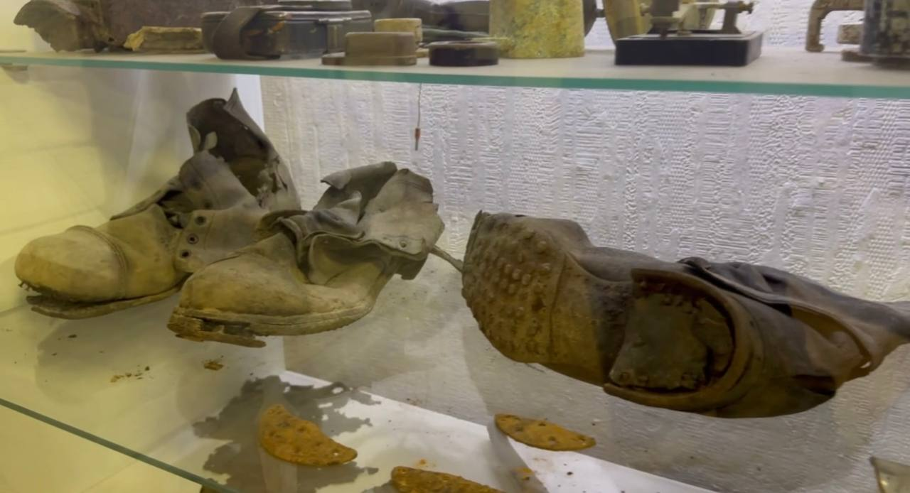 Среди экспонатов также есть детский ботиночек, найденный рядом с немецким блиндажом в Ленинградской области.