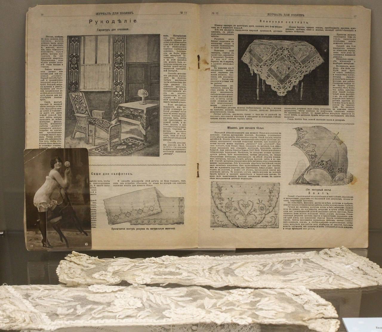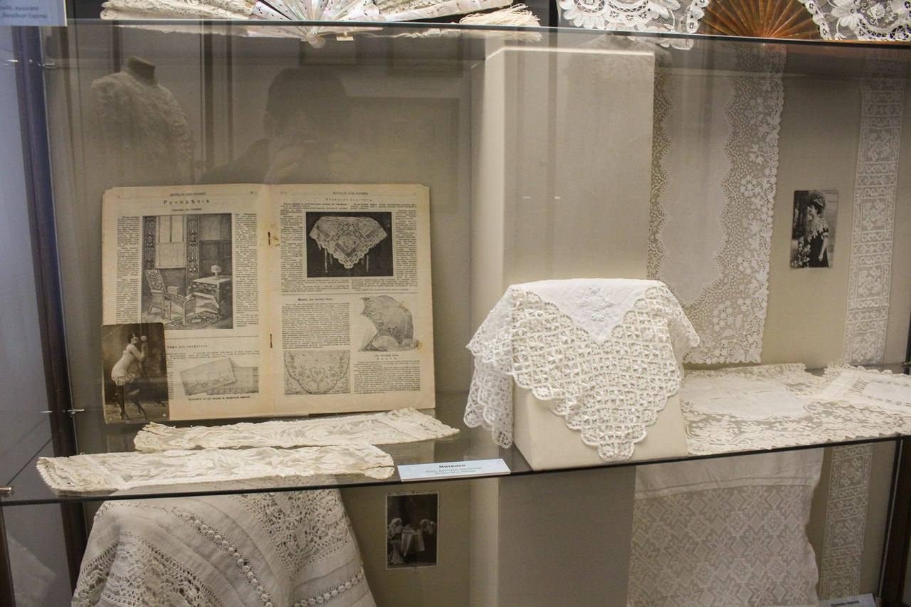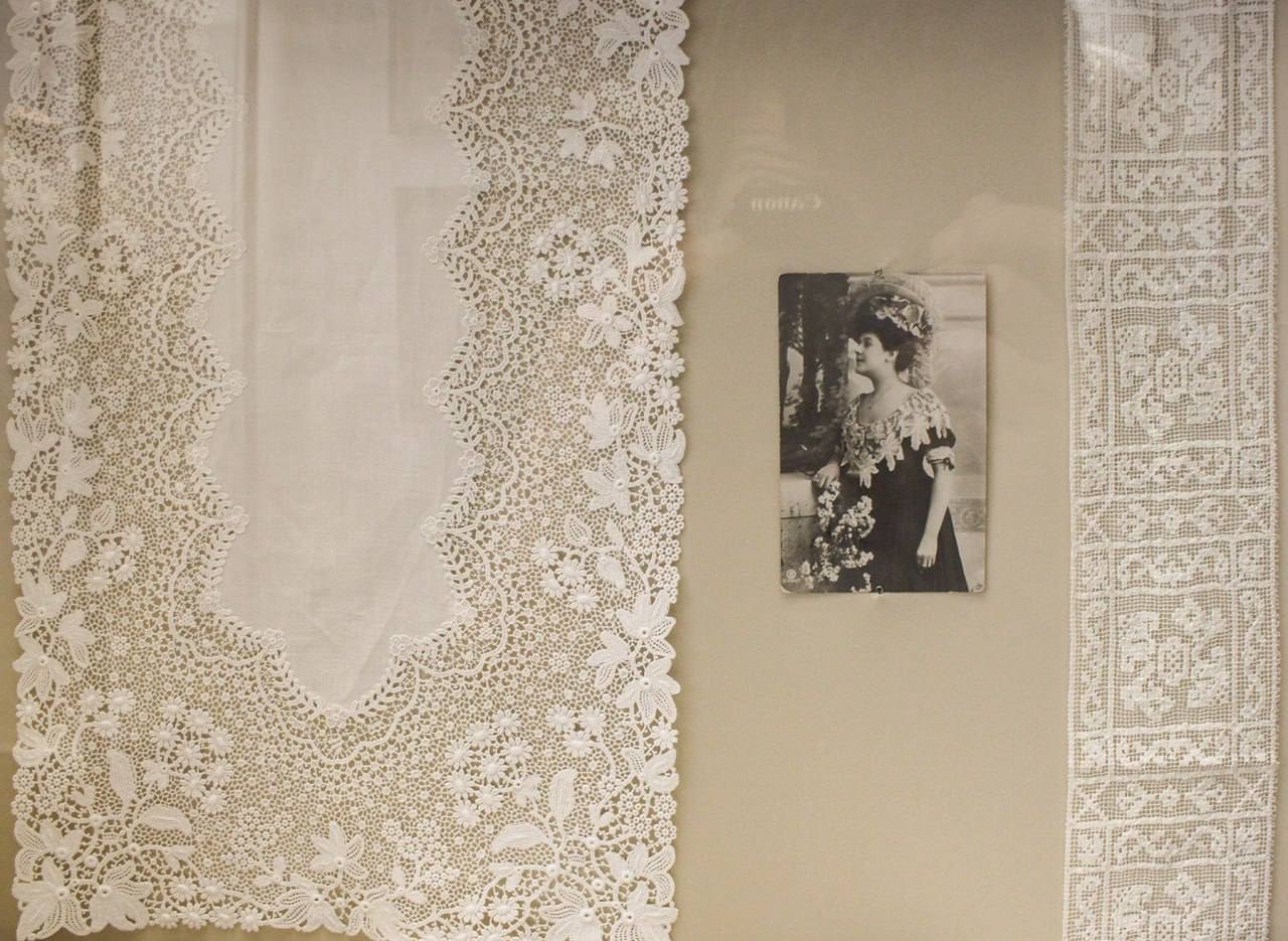 Здесь можно увидеть различные кружевные изделия рубежа XIX-XX веков, а также фотографии и книги по кружевному искусству.