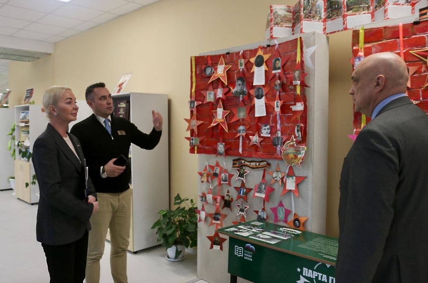 Директор школы Дмитрий Грибков провел для гостей экскурсию и рассказал о важных инициативах, реализуемых в учебном заведении. Одна из которых – «Парта Героя».