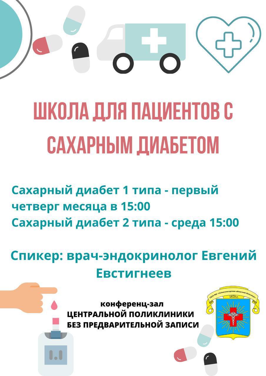 Для пациентов с диабетом второго типа занятия будут проходить по средам в 15:00, а для пациентов с диабетом первого типа - каждый первый четверг месяца в 15:00.