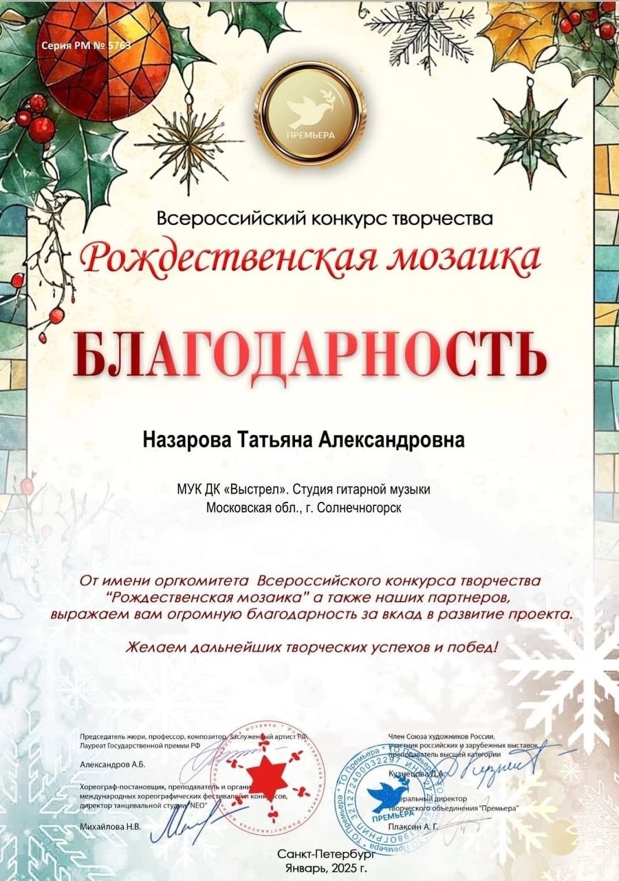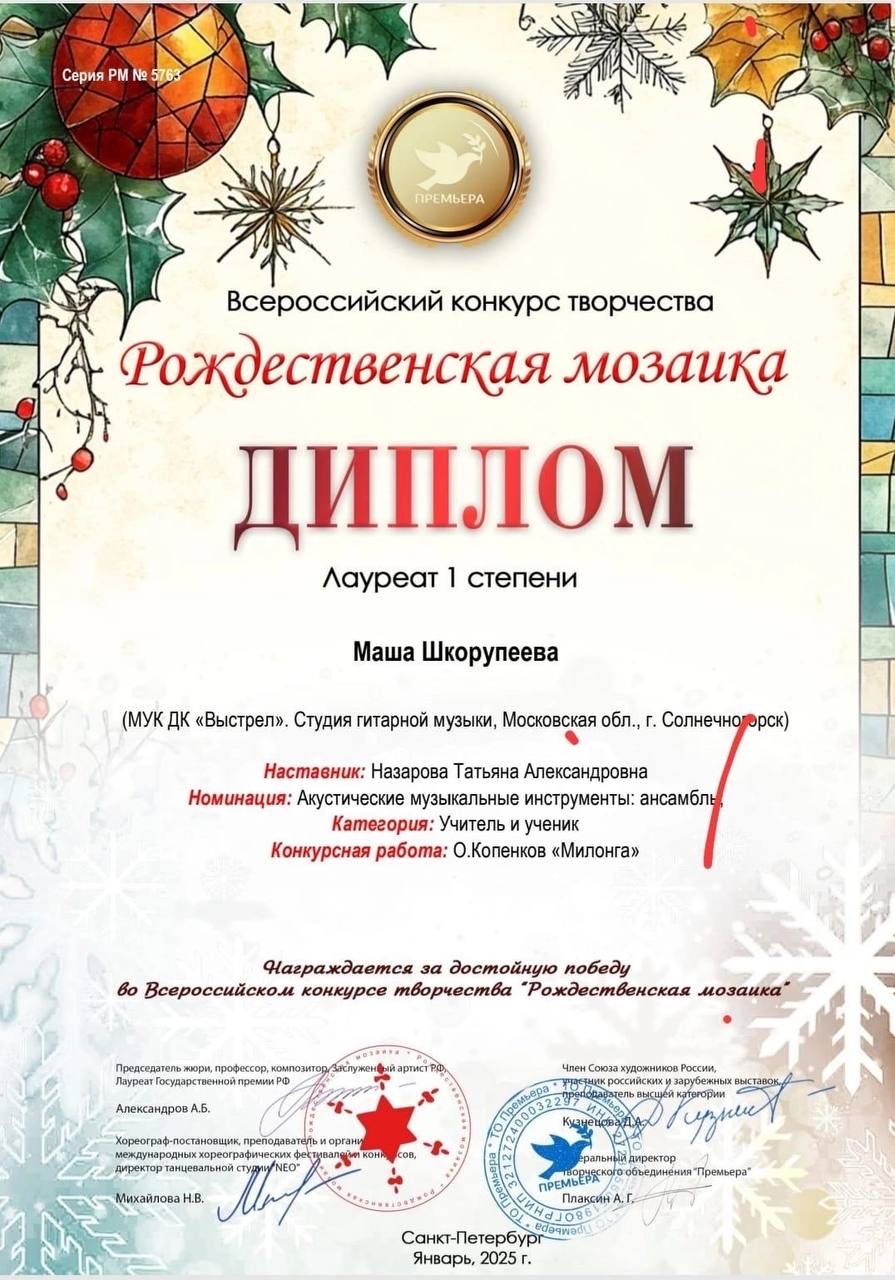 Воспитанница гитарной музыки в Доме культуры «Выстрел» Солнечногорска Мария Шкорупеева приняла участие во Всероссийском онлайн-конкурсе творчества «Рождественская мозаика». Девушка стала лауреатом первой степени в номинации акустические музыкальные инструменты: ансамбль.
