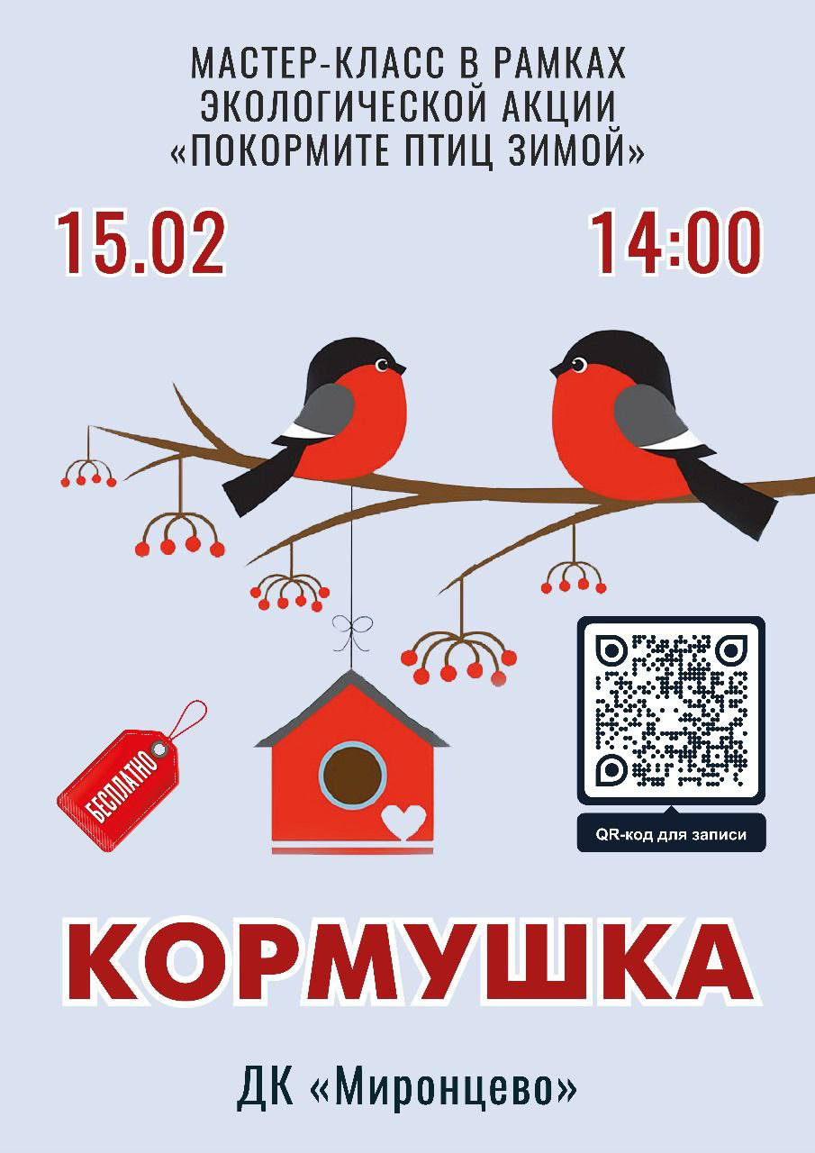 Дом культуры «Миронцево» приглашает юных жителей Солнечногорска принять участие в мастер-классе по изготовлению кормушек в рамках экологической акции «Покормите птиц зимой». Мероприятие состоится 15 февраля, начало в 14:00.