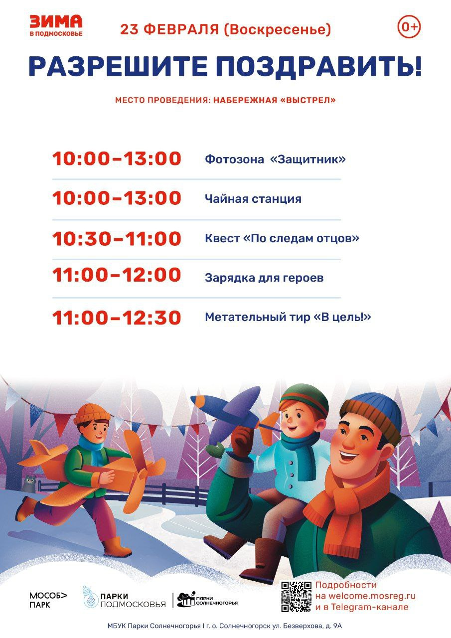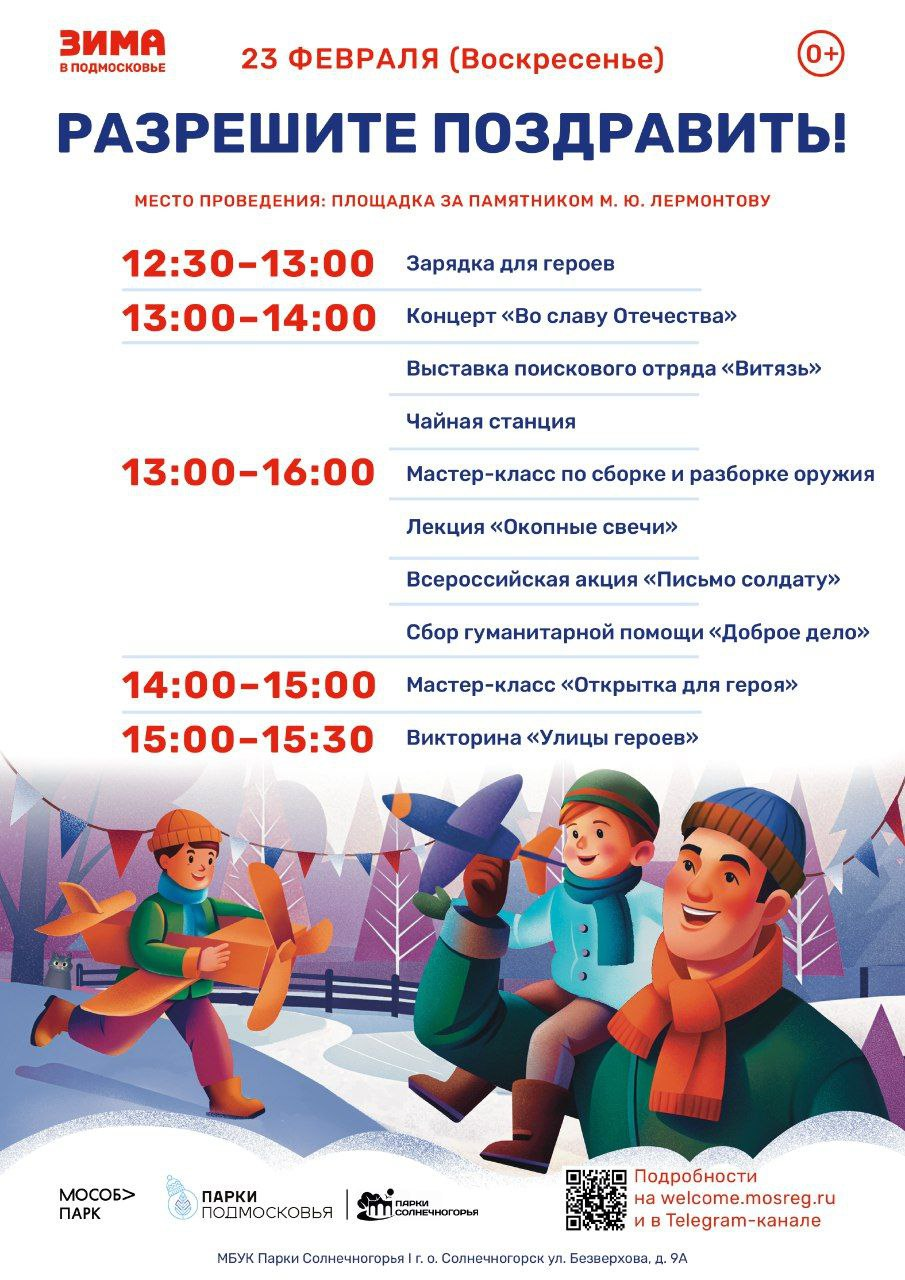 В городском парке культуры и отдыха Солнечногорска 23 февраля, в воскресенье, пройдет общеобластное мероприятие «Разрешите поздравить» в честь Дня Защитника Отечества. Гостей праздника ждут две локации с множеством мероприятий.