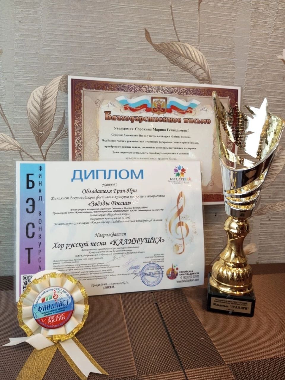 Хор русской песни «Калинушка» Дома культуры «Андреевка» из Солнечногорска принял участие во Всероссийском фестивале-конкурсе искусств и творчества «Звезды России». Конкурс собрал участников из различных уголков России, включая Краснодар, Воронеж, Липецк, Кабардино-Балкарскую Республику, Сочи, Гусь-Хрустальный и другие города.
