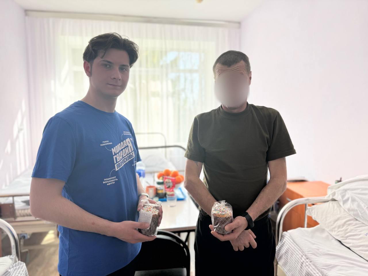 Активисты местного отделения «Молодой Гвардии Единой России» посетили Тимоновский госпиталь, чтобы поздравить бойцов с наступающим праздником Пасхи. Ребята освятили более двухсот куличей в местной часовне и раздали военнослужащим.