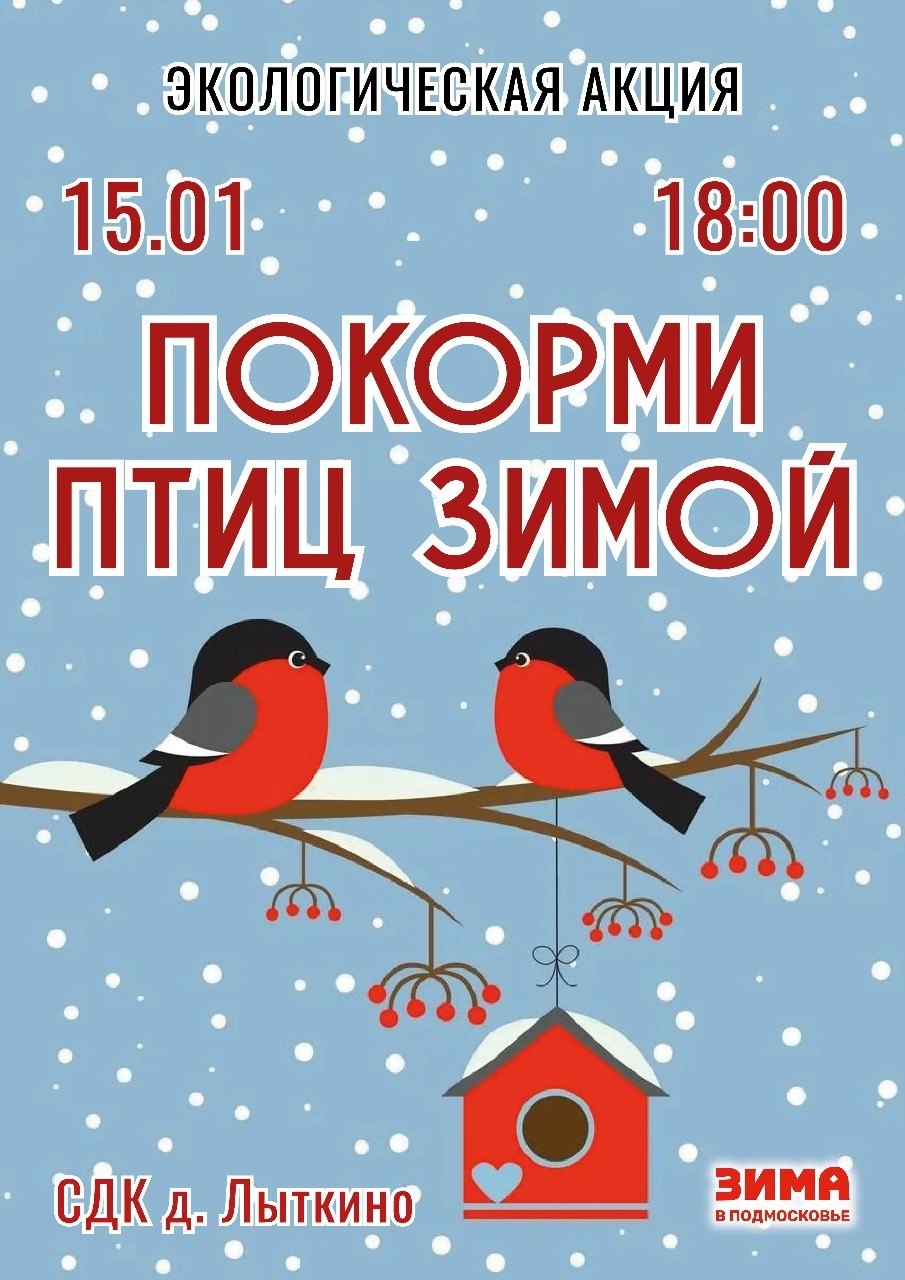 В сельском Доме культуры деревни Лыткино городского округа Солнечногорск пройдёт экологическая акция «Покорми птиц зимой». Мероприятие состоится в среду, 15 января, в 18:00.