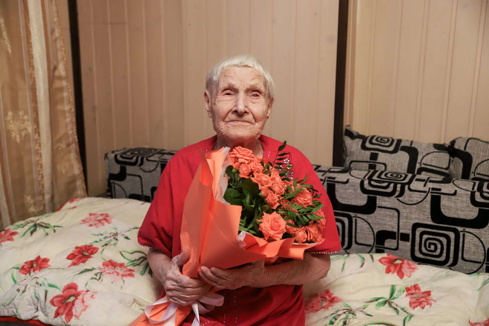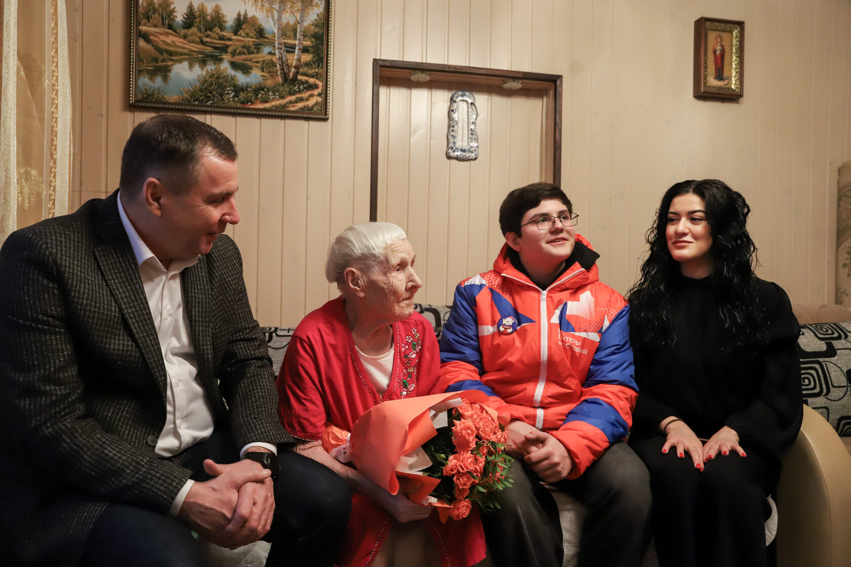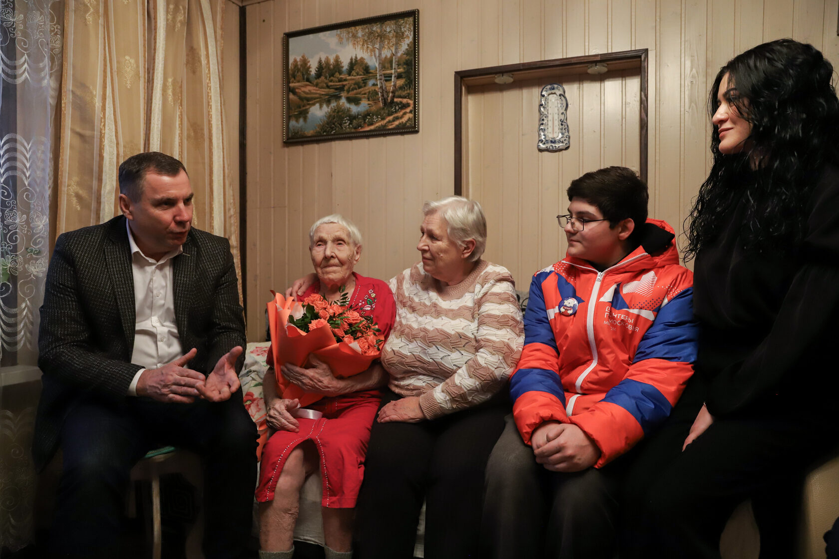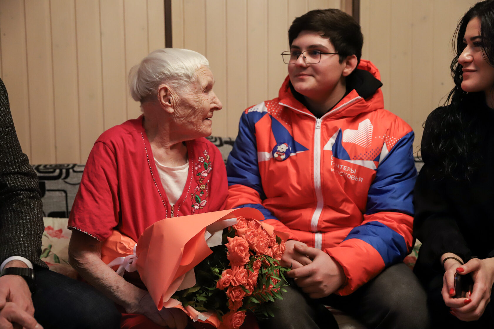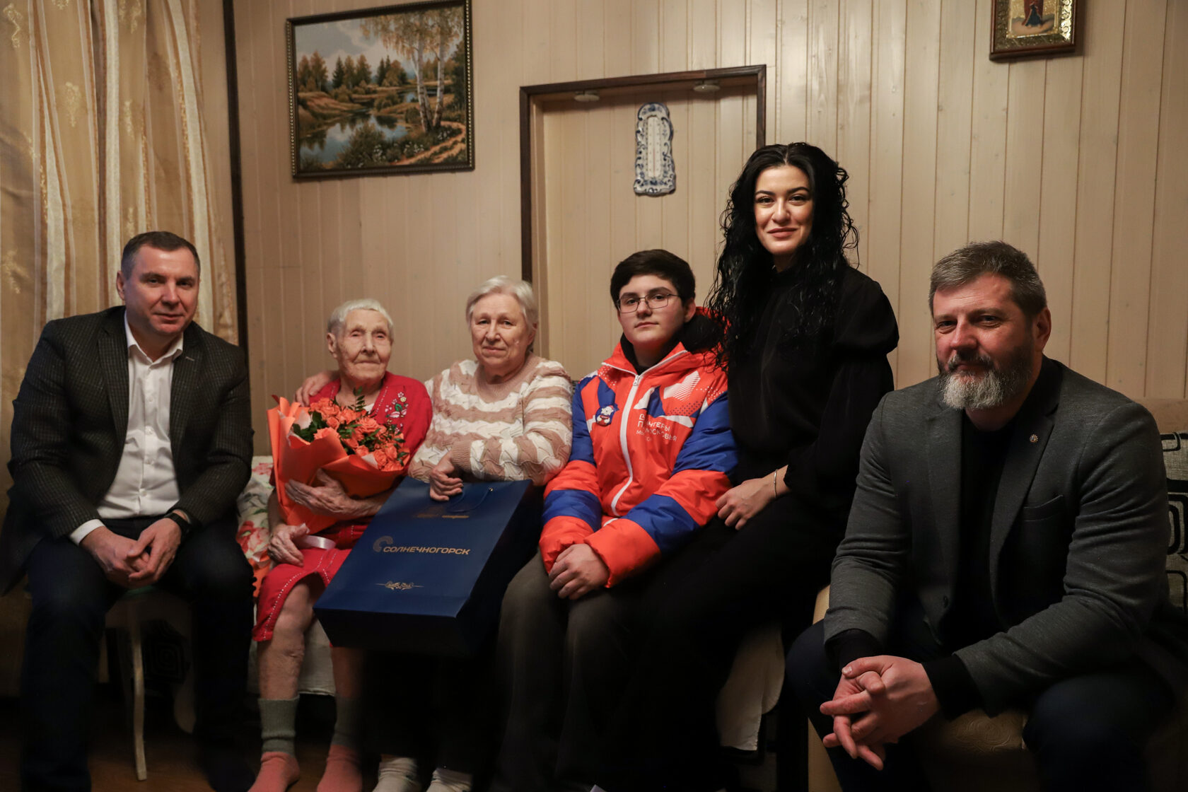 Поздравили жительницу Солнечногорска Агафию Розвезеву первый заместитель главы городского округа Солнечногорск Александр Кузьмин и волонтер Даниил. Имениннице вручили букет цветов и теплый, мягкий плед.