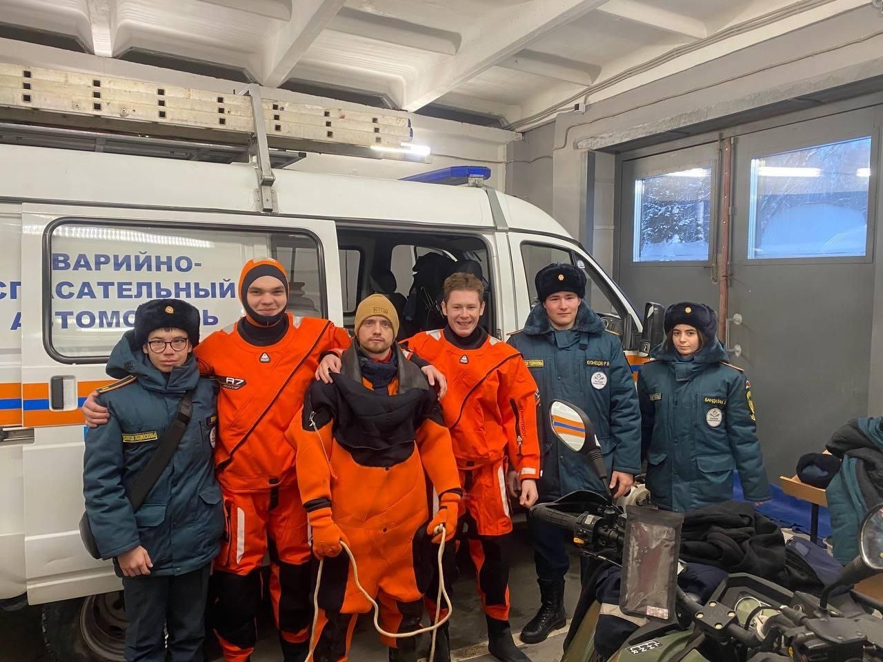 Вторая часть практического урока была посвящена способам спасения пострадавших из ледяной полыньи. Специалисты объяснили, как можно помочь провалившемуся под лед с помощью спасательных, а также подручных средств с учетом различной толщины и хрупкости льда. Также студентам продемонстрировали различные способы самоспасения и рассказали о правилах оказания первой помощи человеку в случае переохлаждения.
