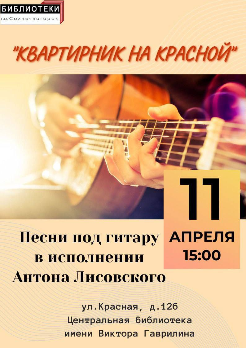 Центральная библиотека имени Виктора Гаврилина в Солнечногорске приглашает на музыкальное мероприятие «Квартирник на Красной». Для жителей и гостей округа выступит исполнитель Антон Лисовский.