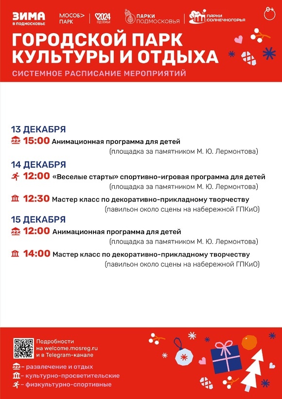С 9 по 15 декабря в парке проведут спортивные и творческие мероприятия для жителей и гостей муниципалитета. В программе для детей запланированы мастер-классы по декоративно-прикладному творчеству, анимационные программы и «весёлые старты». Возраст участия от трёх лет.