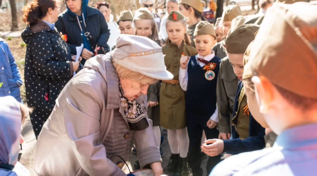 Ирина Фёдоровна бывший учитель труда в гимназии №6, общий трудовой стаж педагогом составляет 50 лет. Когда началась война ей было всего пять лет. Ребята на уличном концерте исполнили военные песни и прочитали стихи. Специально к этому мероприятию школьники подготовили военную форму.