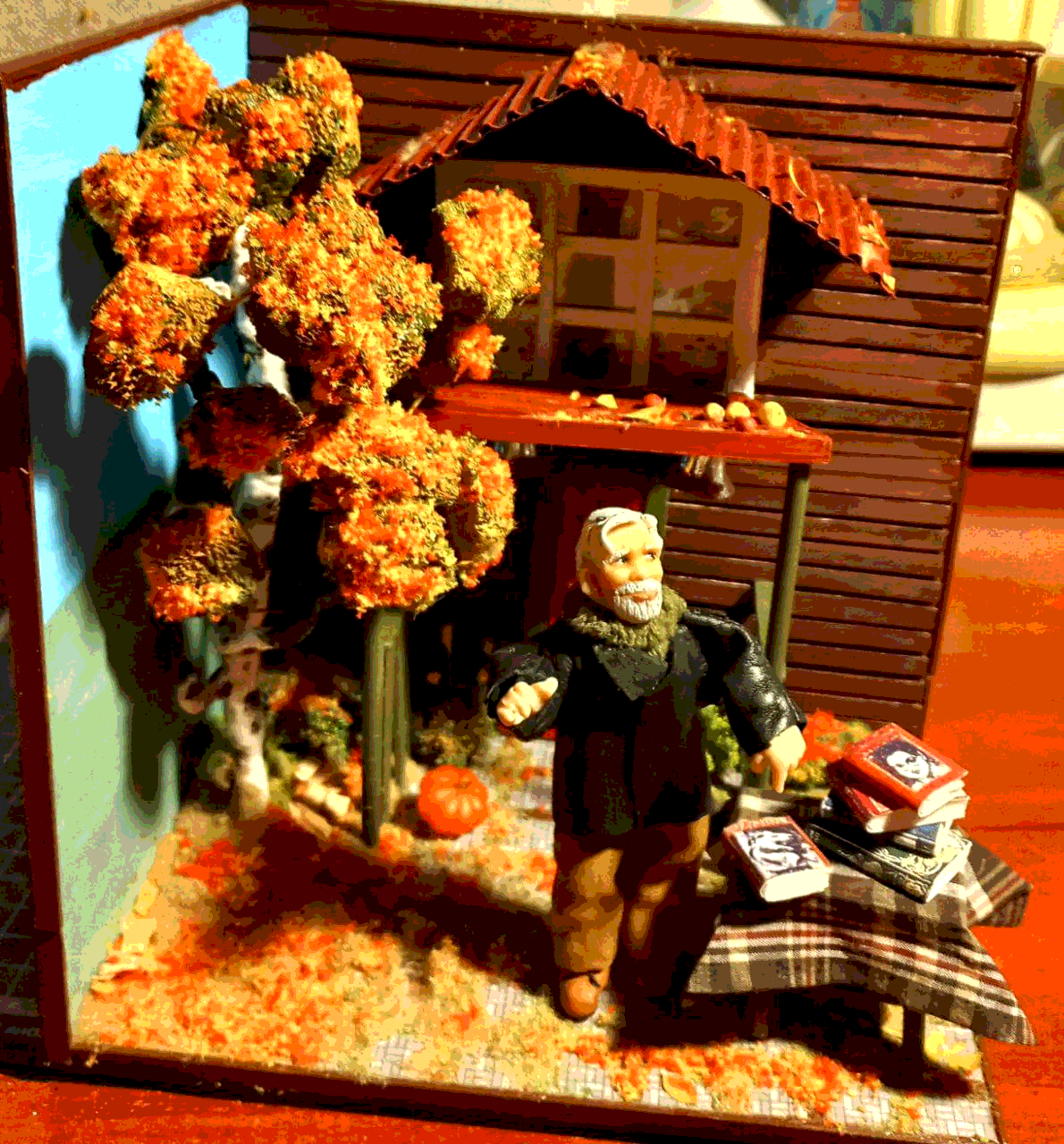 «Среди экспонатов можно увидеть букнук - декоративную вставку между книгами, имитирующую элемент интерьера. В данном случае это дачный участок писателя в период золотой осени. Идея букнуков зародилась в Японии, где в 2018 году прошла первая выставка подобных работ», — рассказала заведующая Центральной библиотекой имени Виктора Гаврилина Ольга Журавлева.