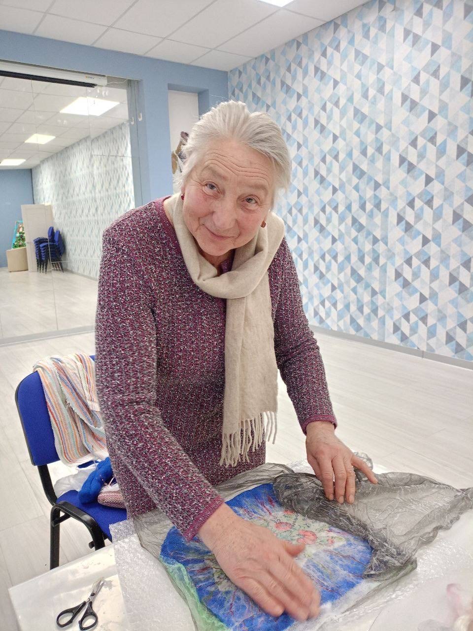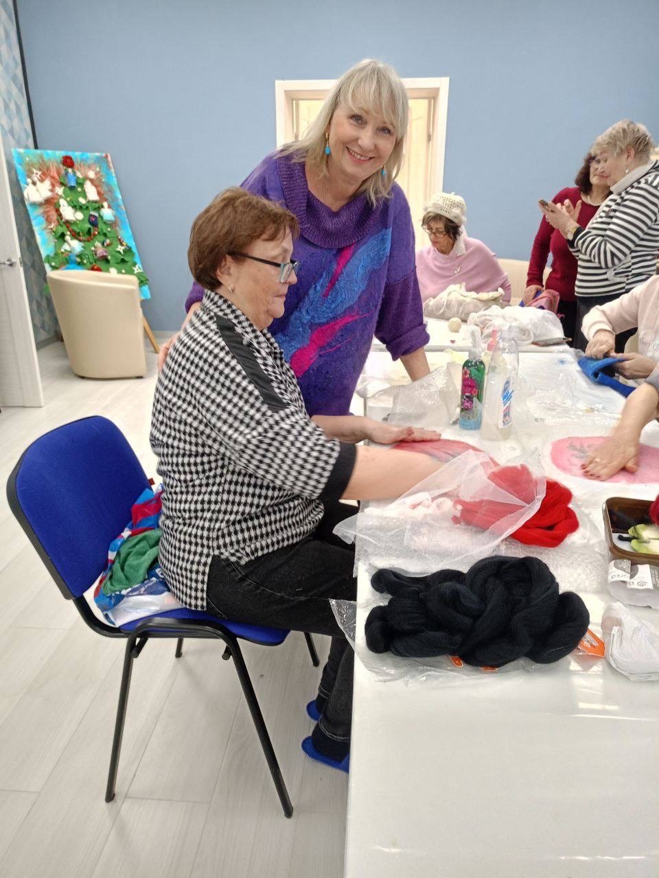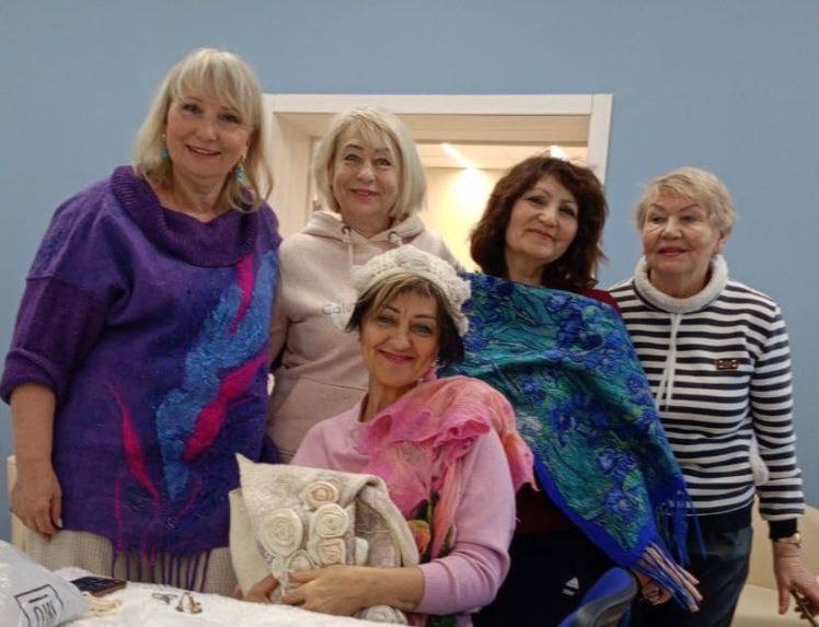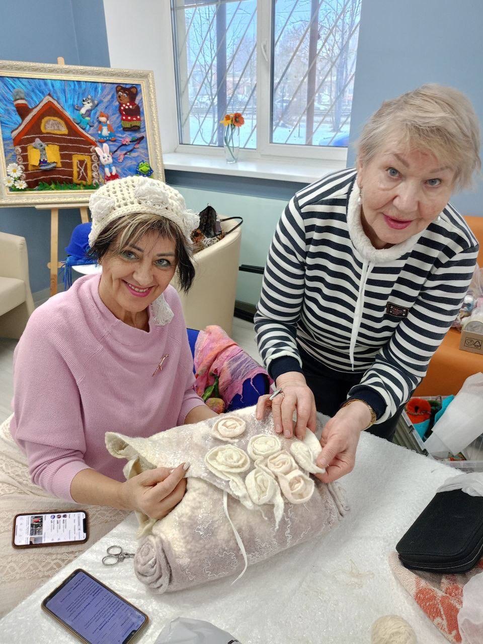 В центре «Активное долголетие» в Солнечногорске прошел мастер-класс по мокрому валянию. Участники создавали салфетки-маки, доваливали косметички, а продвинутые мастерицы приступили к созданию колье-оплечья, работа над которым рассчитана на несколько занятий.