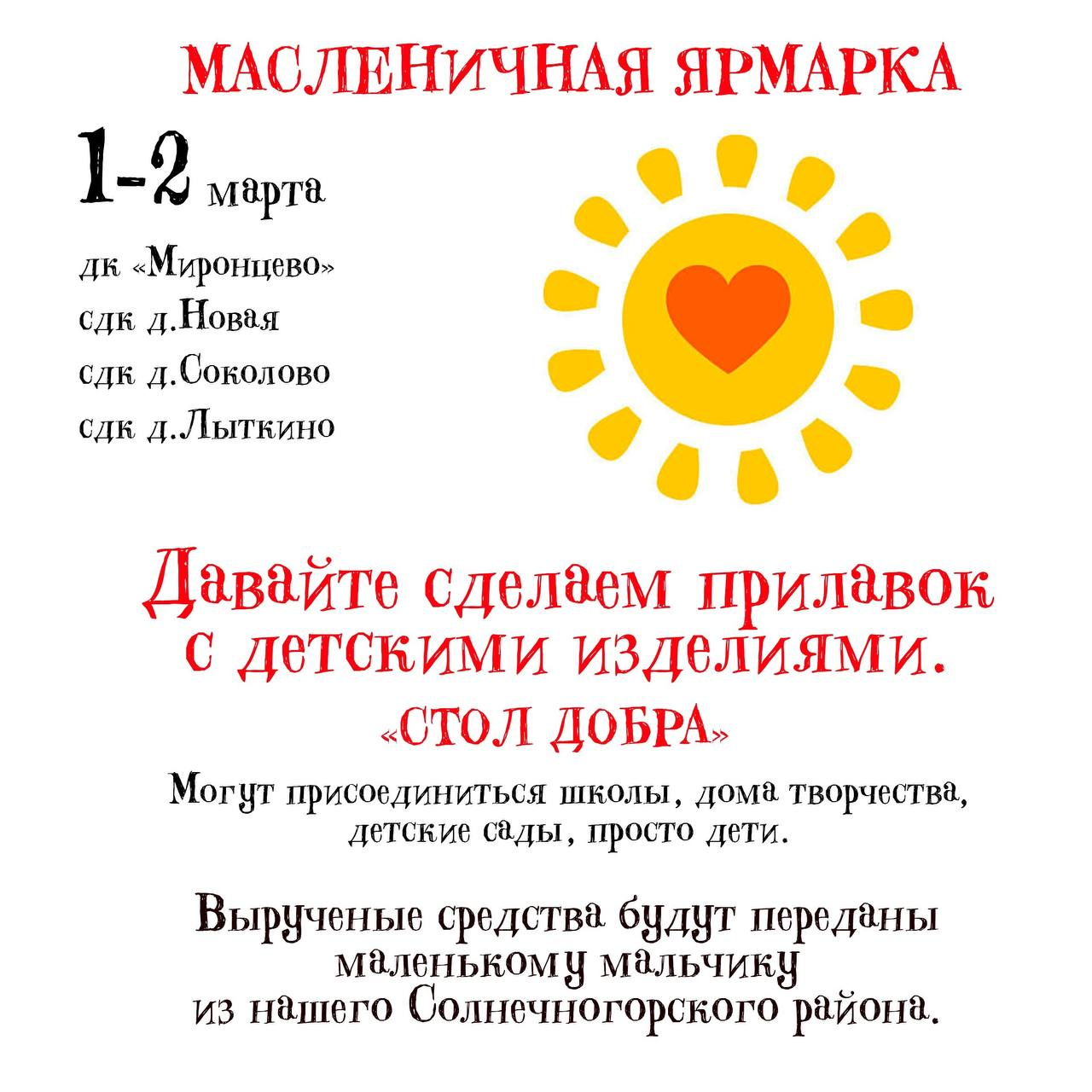 Центральным событием ярмарки станет организация «Стола добра», где любой желающий сможет принести на продажу все, что посчитает нужным. Все собранные средства с этого стола пойдут на лечение Вити Ивко, страдающего редким генетическим заболеванием — миодистрофией Дюшенна.