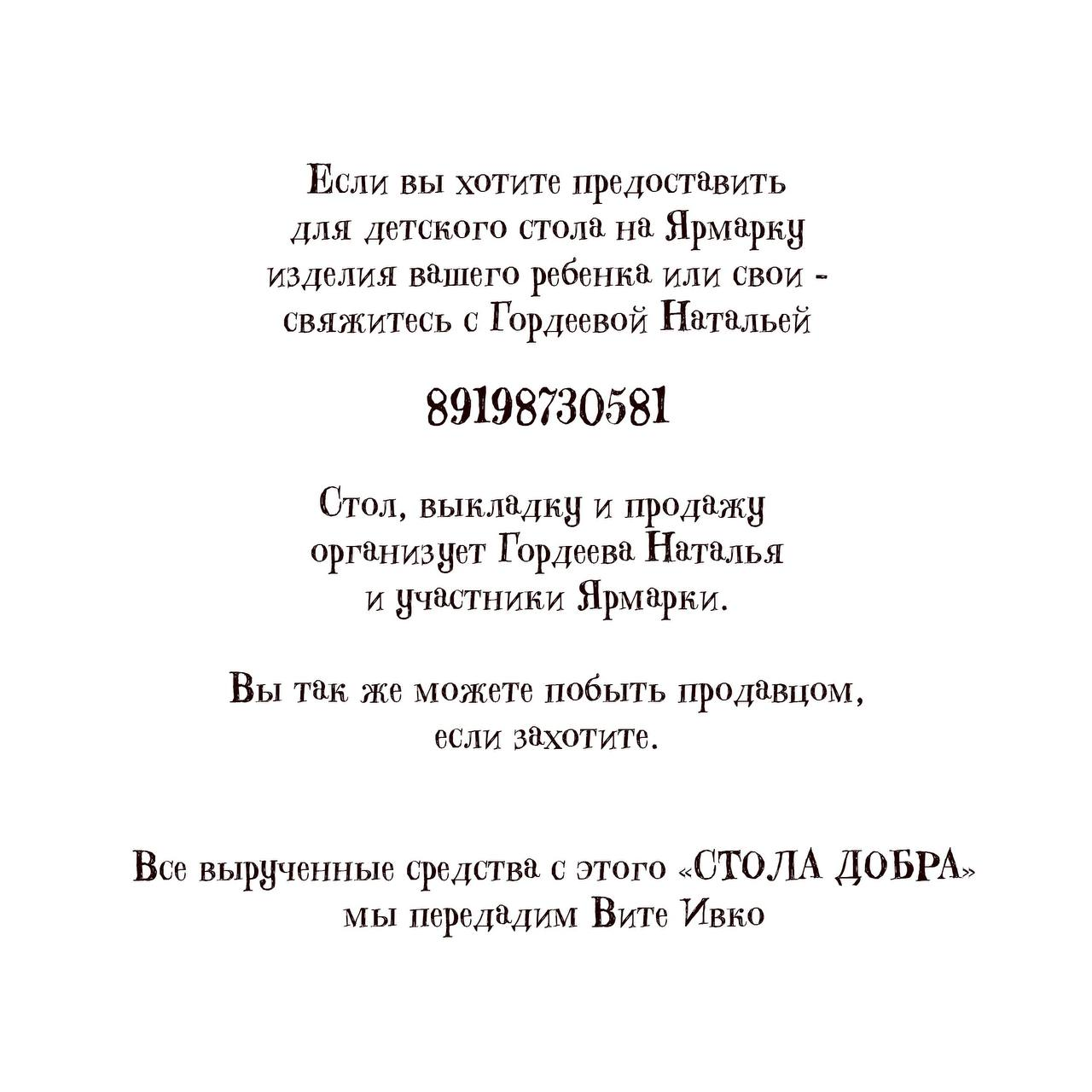 «Я уже принимала участие в сборе средств для Вити, и видела, насколько важна любая поддержка. У нас замечательная команда волонтеров, а мама Вити — настоящий герой. Именно поэтому мы решили создать такой «Стол добра». Здесь нет маленькой помощи — важен каждый вклад!», — организатор акции Наталья Гордеева.