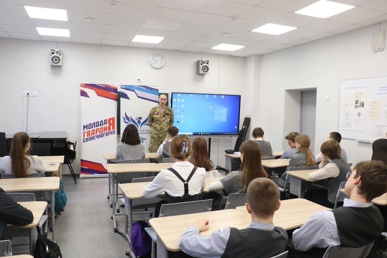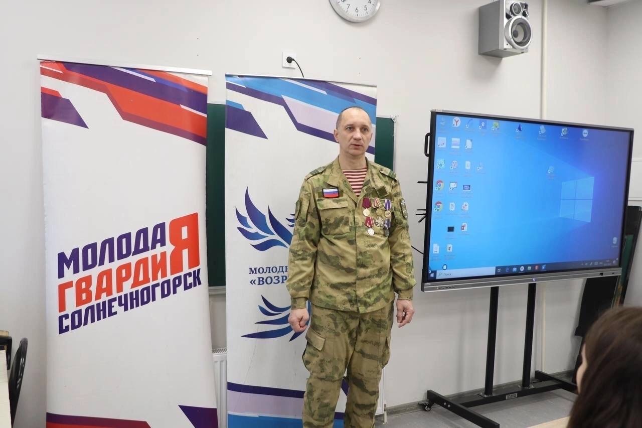 Активисты местного отделения Молодой Гвардии организовали «Урок мужества» в лицее №7 в Солнечногорске. Учащиеся встретились с ветераном специальной военной операции Александром Воронковым.