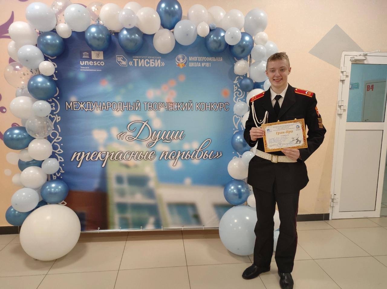 Кадет Радумльского лицея-интерната имени Василия Татищева из Солнечногорска Алексей Соломенцев принял участие во Всероссийском творческом конкурсе «Души прекрасные порывы». Конкурс проходил в Казани и собрал учащихся с первого по одиннадцатый класс со всей России.