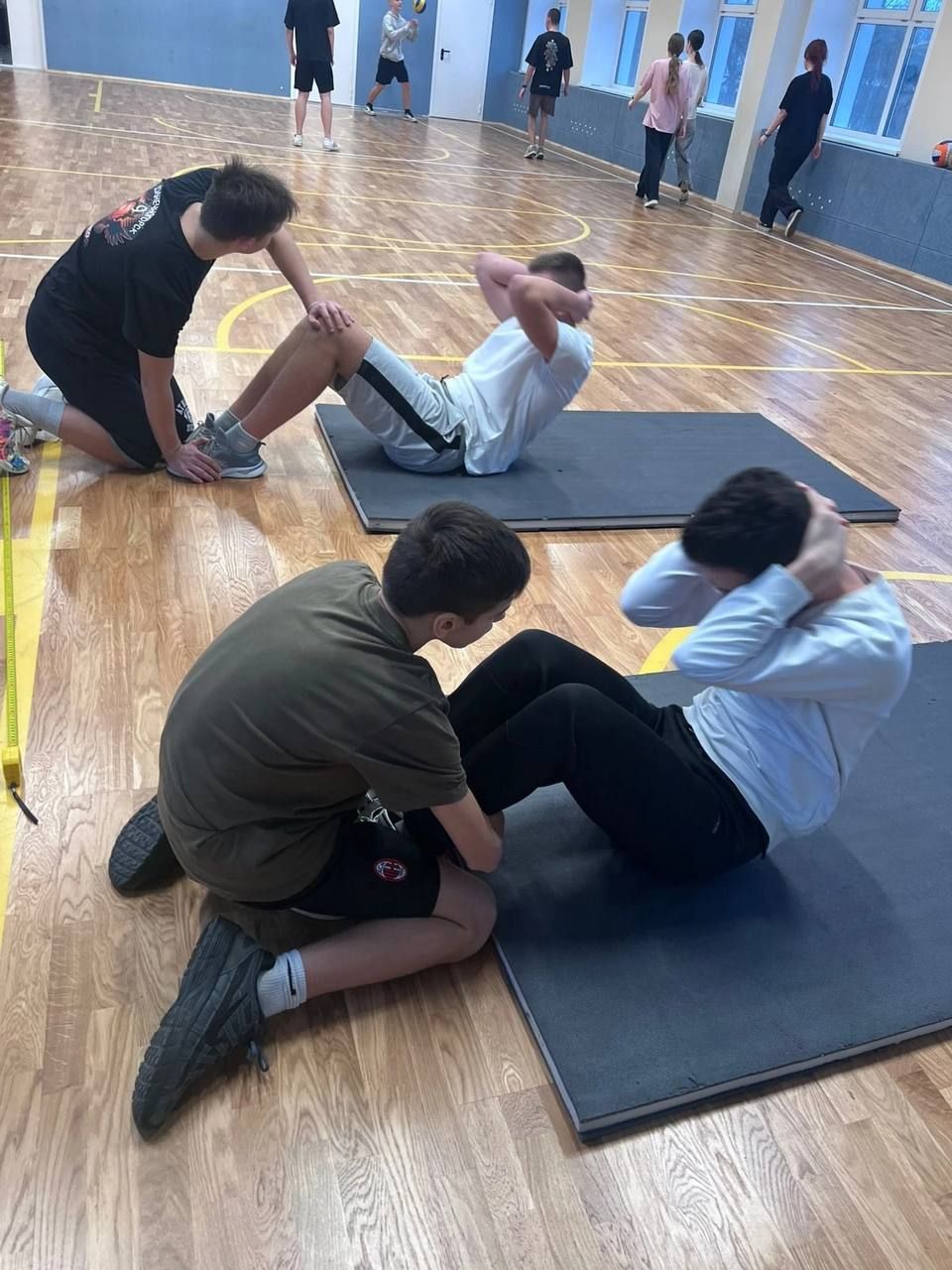 Школьники выполняли разнообразные испытания: прыжки в длину, наклоны вперед, челночный бег, отжимания и упражнения на пресс.