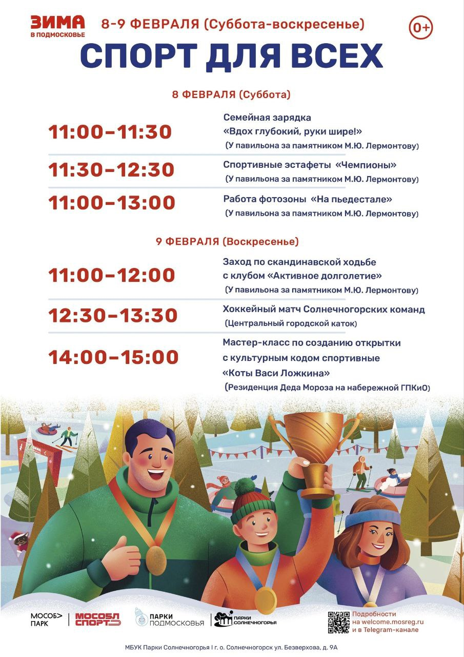 9 февраля мероприятия стартуют в 11:00 и продлятся до 15:00. Участников приглашают присоединиться к заходу по скандинавской ходьбе с клубом «Активное долголетие», также состоятся хоккейный матч команд Солнечногорска и мастер-класс по созданию открытки с культурным кодом «Коты Васи Ложкина».
