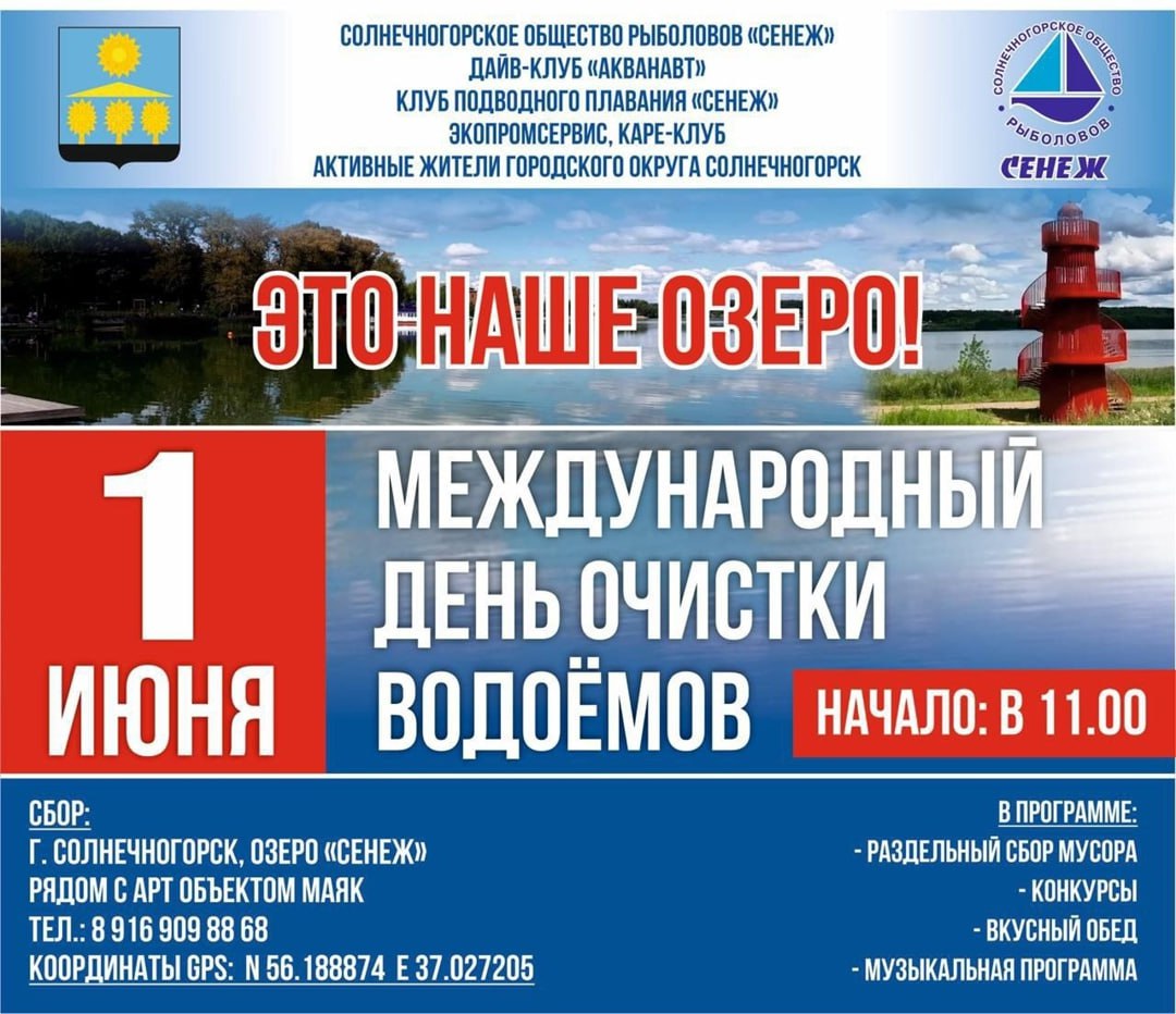 1 июня жители Солнечногорска смогут присоединиться к празднованию Международного дня водоемов. По информации Администрации городского округа, в этот день состоится масштабная экологическая акция по очистке акватории озера Сенеж от мусора.
